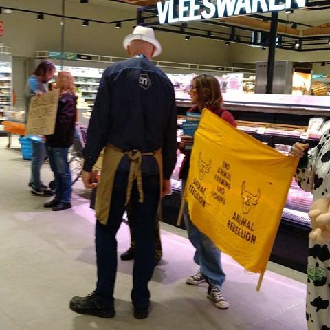 16-07-2022 Happening now! ⚠️ Onze rebellen protesteren vandaag bij supermarkt Albert Heijn om aandacht te vragen voor de rol van supermarkten in de klimaat- en ecologische crisis 🌎🥩 én te eisen dat zij en andere supermarkten stoppen met