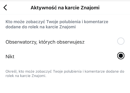 - Zaznacz opcję Nikt, aby Twoje polubienia i komentarze pod Rolkami nie były pokazywane Twoim znajomym w tej sekcji.