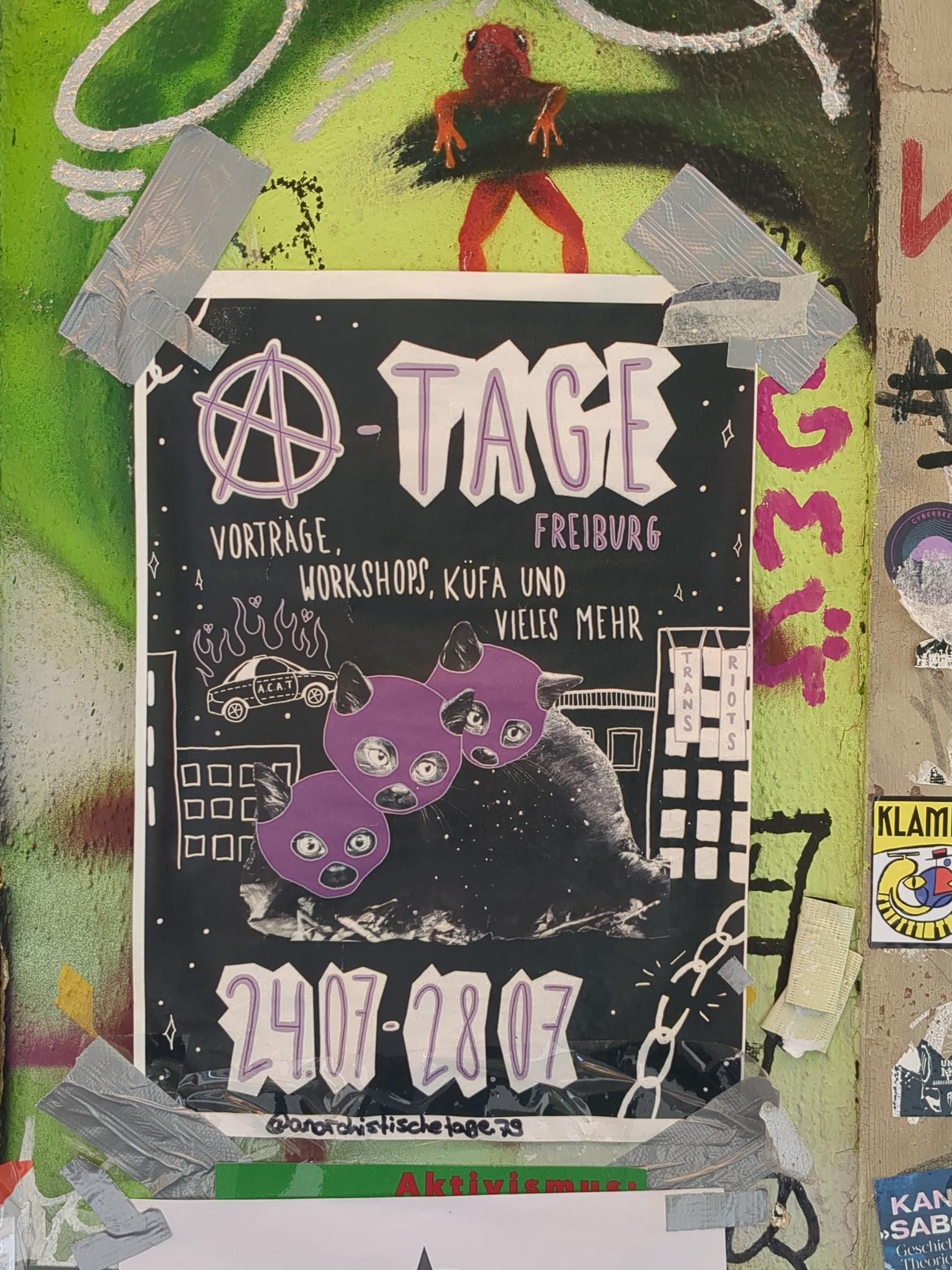Vom 24.07.2025 bis zum 28.07.2025 finden in Freiburg die Anarchistischen Tage statt. Es wird verschiedene Workshops geben. Darunter beispielsweise einen zur Sicherheitskultur in politischen Gruppen. Ebenso eine queer-anarchistische Analyse von Patriarchat und Staatsfeminismus. Ab er auch etwas darüber, wie Menschen in Gefängnissen Briefe geschrieben werden können, oder auch zur Abschaffung von Gefängnissen.