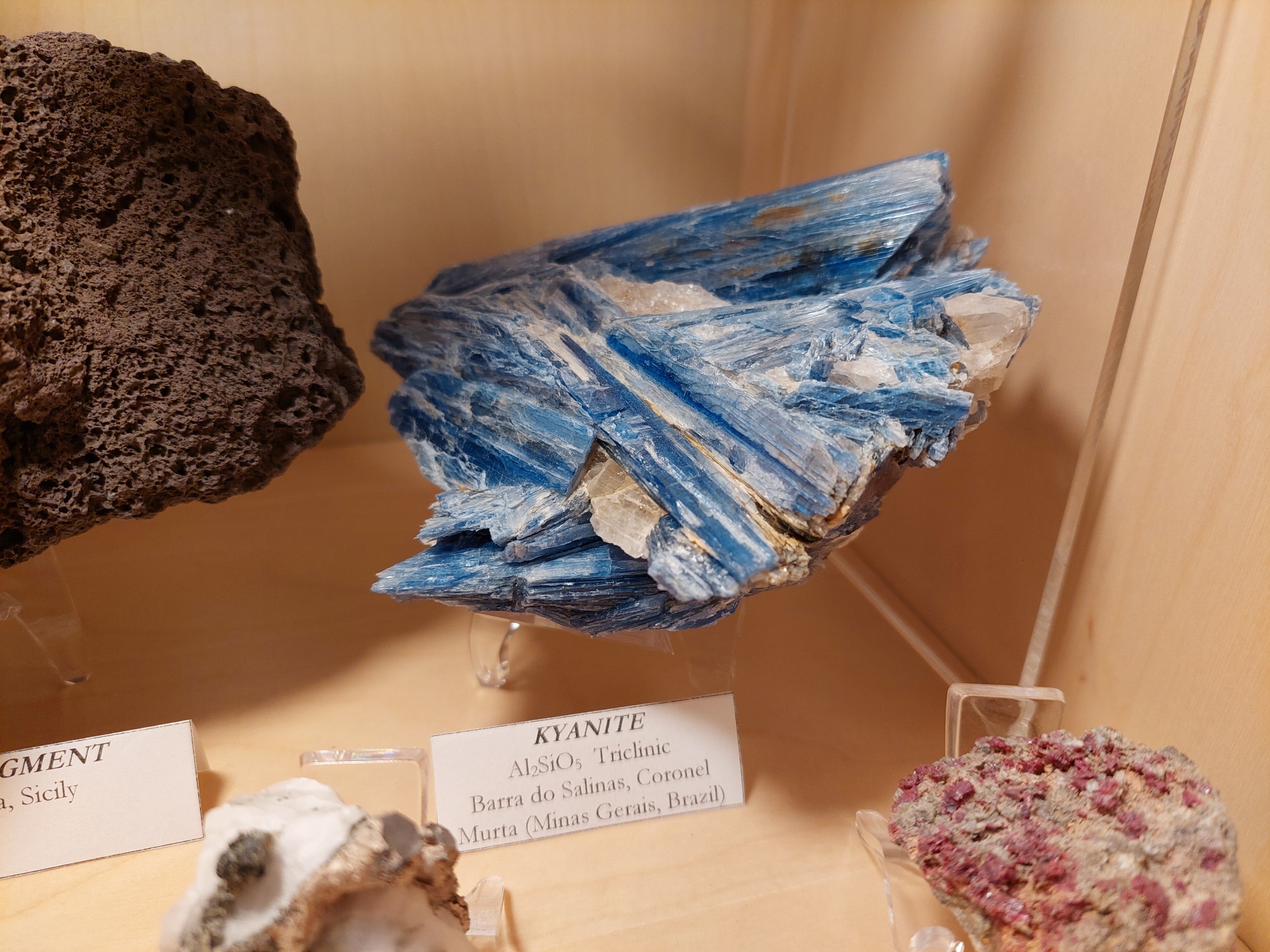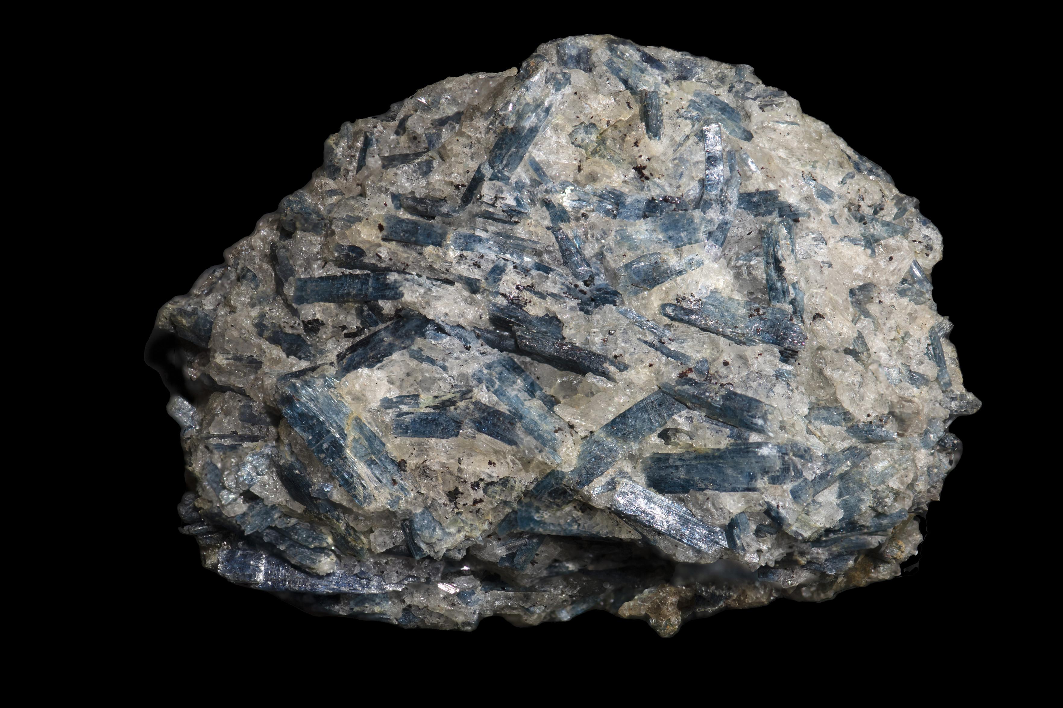 Rare blue yoderite replacing kyanite (-talc + quartz). Only found in two places on Earth (Tanzania and Zimbabwe), yoderite forms at high pressure in hot subduction zones from rocks rich in in Mg and Al, poor in alkalis and Ca, in the presence of water and oxidized ferric iron (±Mn).