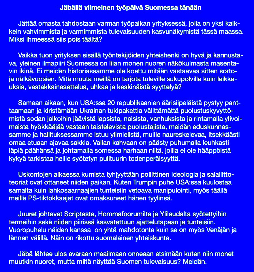 KU:ssa Emilia Männynvälin perusteellinen kirjoitus pessimismiä tutkivan dogmatiikan professorin Olli-Pekka Vainion ajatuksista maailmankatsomuksista, ihmisarvosta, oikeudenmukaisuudesta, moraalista, hyötyjärjestä, marttyyriudesta, kulteista, toivosta ja muista pikkuasioista, https://www.ku.fi/artikkeli/5110803-kultti-alkaa-siita-mihin-keskustelu-loppuu-siina-vaiheessa-kannattaa-alkaa-tahyilla-lahinta-ovea