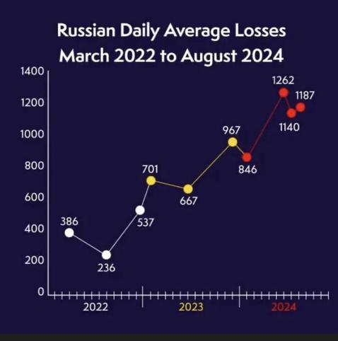 #Venäjä’n armeijan tappioiden kehitystä 2022 -2024. Tuo on vielä varsin pientä tuhoa siihen verrattuna, miten Venäjän demograafinen kehitys 📉 tulee yhteiskuntaa ravistamaan - jos se vielä pystyssä tulee edes pysymään?