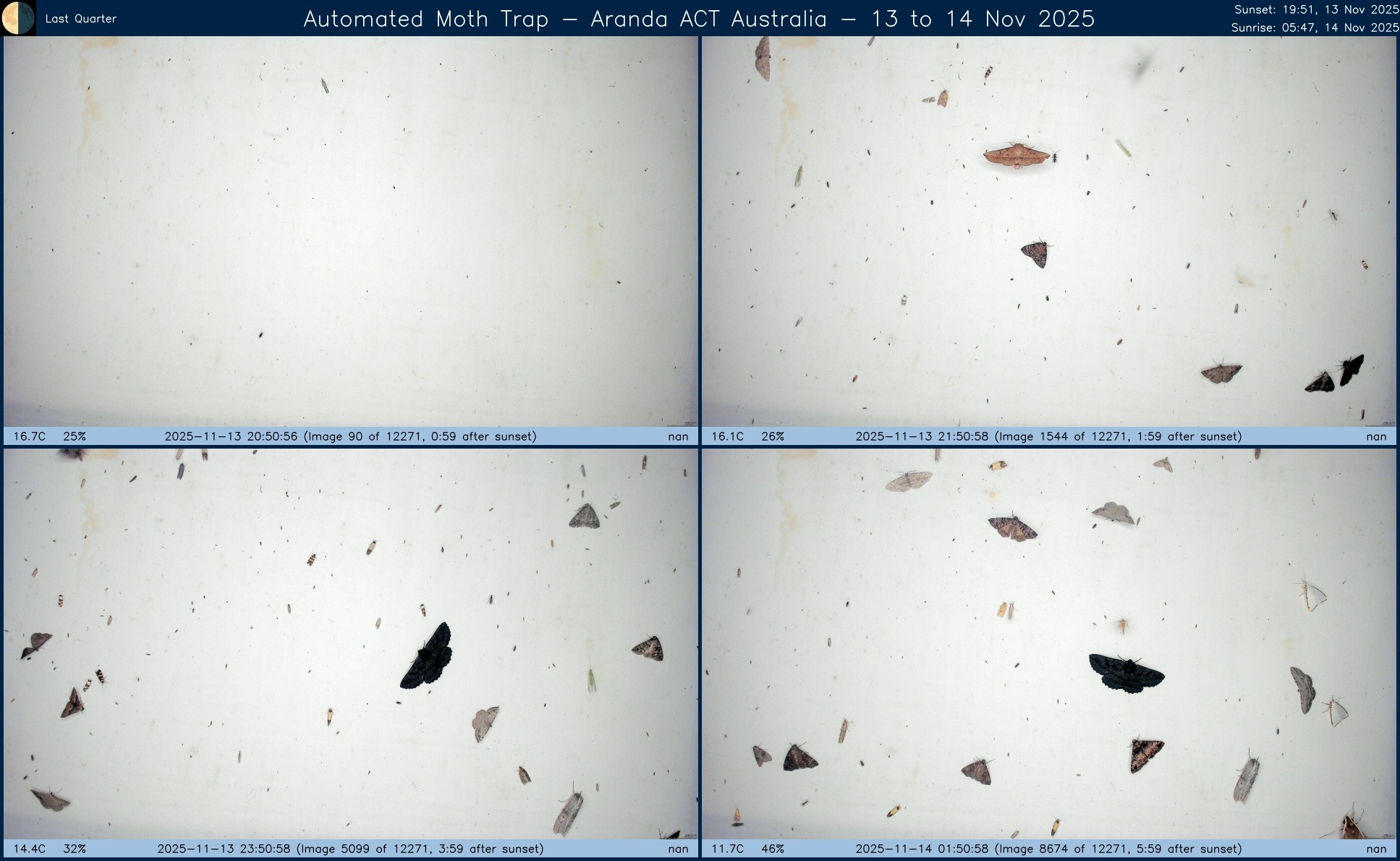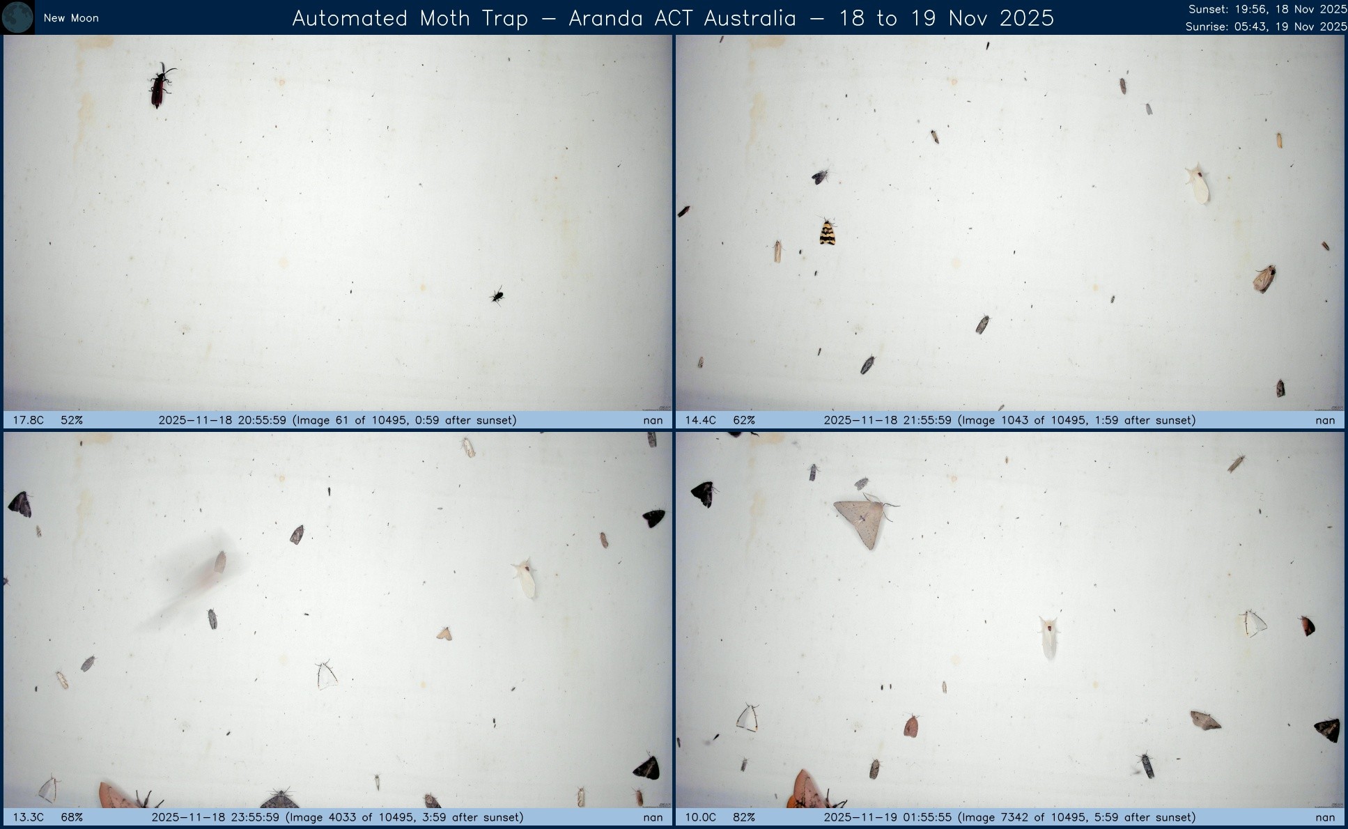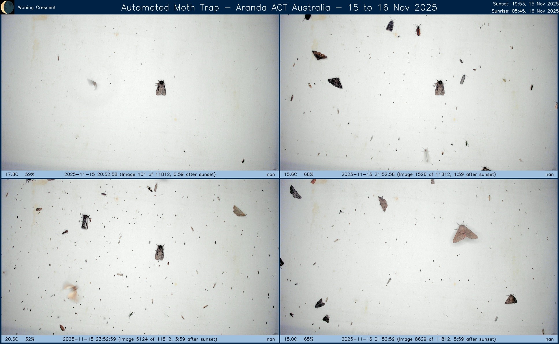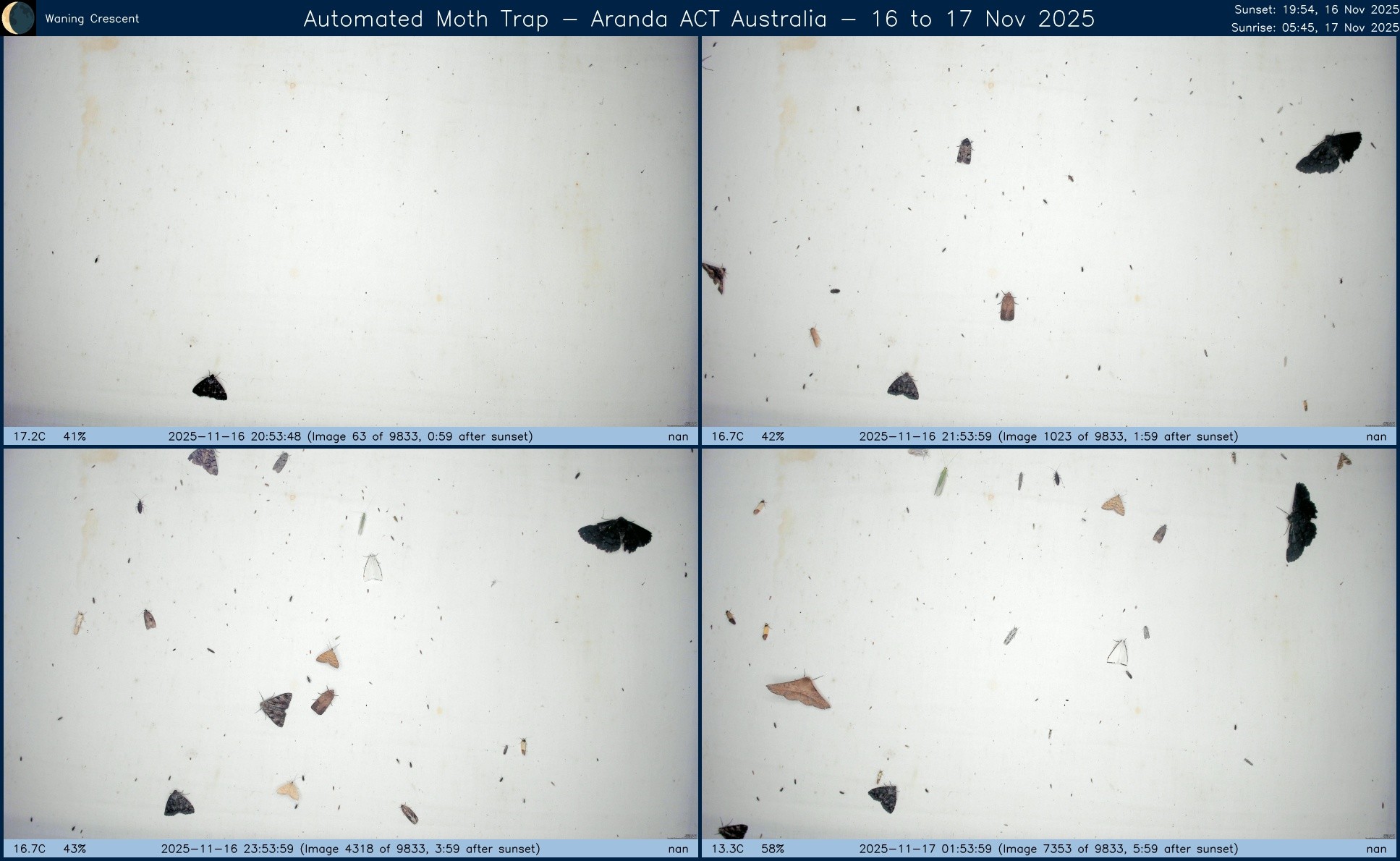 Composite image from #AutomatedMothTrap operated in #Aranda, #ACT, #Australia over night of 26 to 27 Nov 2025.
