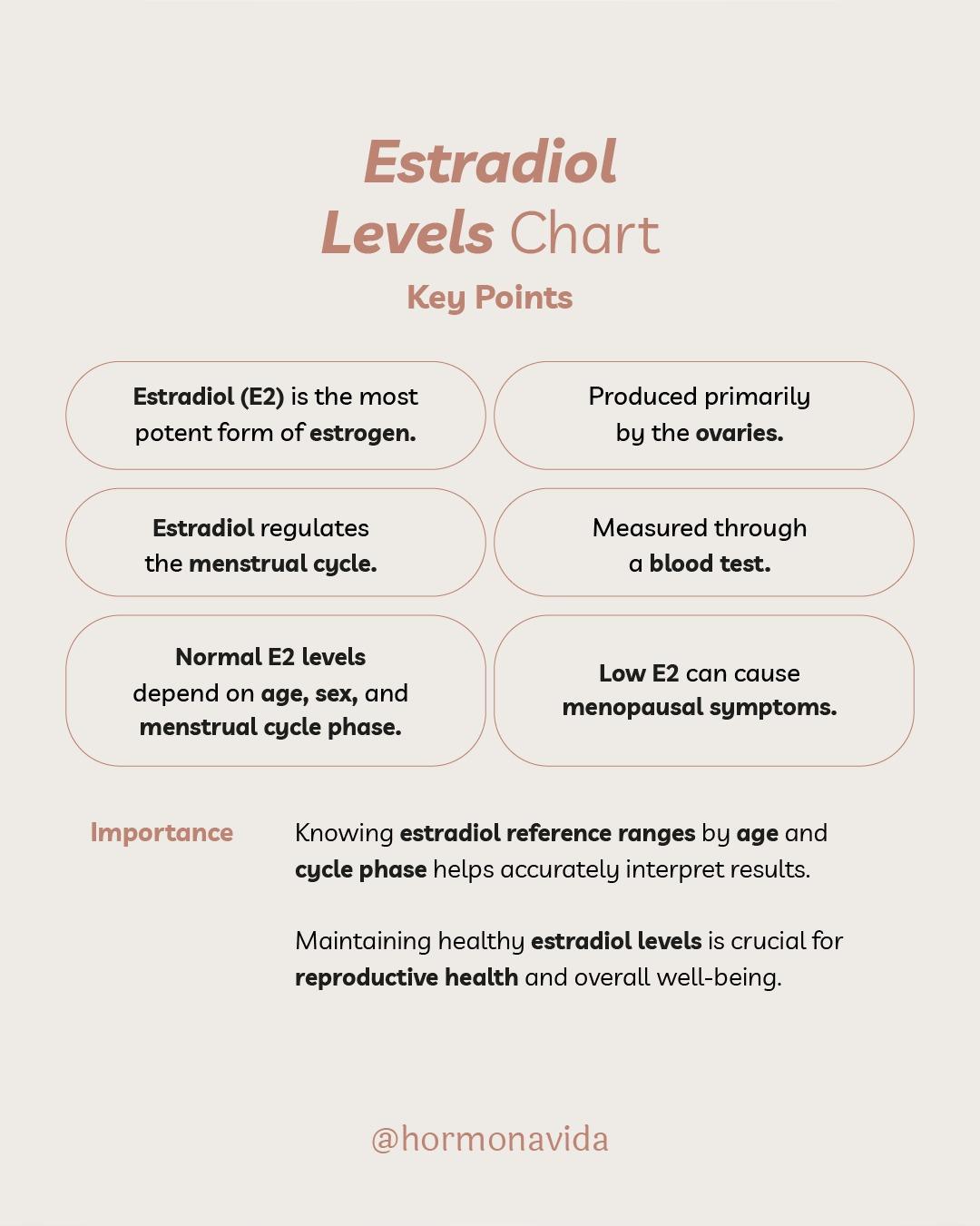 Estradiol e2 is the most potent estrogen in women of reproductive age. The ovaries make most of it. A small amount also comes from the adrenal glands and body fat. Estradiol helps regulate the menstrual cycle and supports bones, skin, mood, sleep, sexual health, and heart wellness. Read more 👉 https://hormonavida.com/estradiol-levels-chart-simple-guide-to-healthy-ranges/ #estradiol #levels #chart #infographic