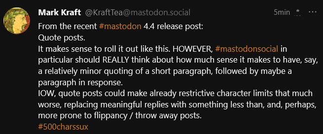 However, limiting the default characters significantly limits #mastodon adoption, as it is inappropriate for what they want to do... which could be everything from #journalism to #writing to #fanfiction.