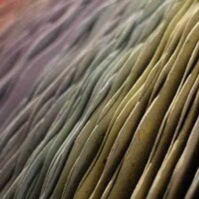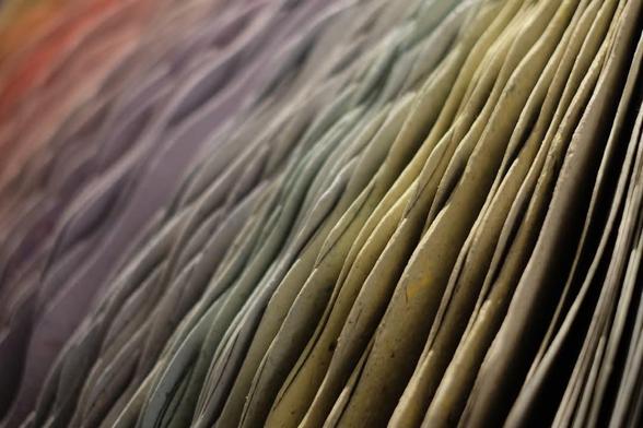 Papier réalisé avec des romans désherbés de bibliothèque, broyés et recyclés. Pigments réalisés à partir de noix de galle du chêne, de bouleau, de bogues de châtaigne et de fleurs d’ajoncs.