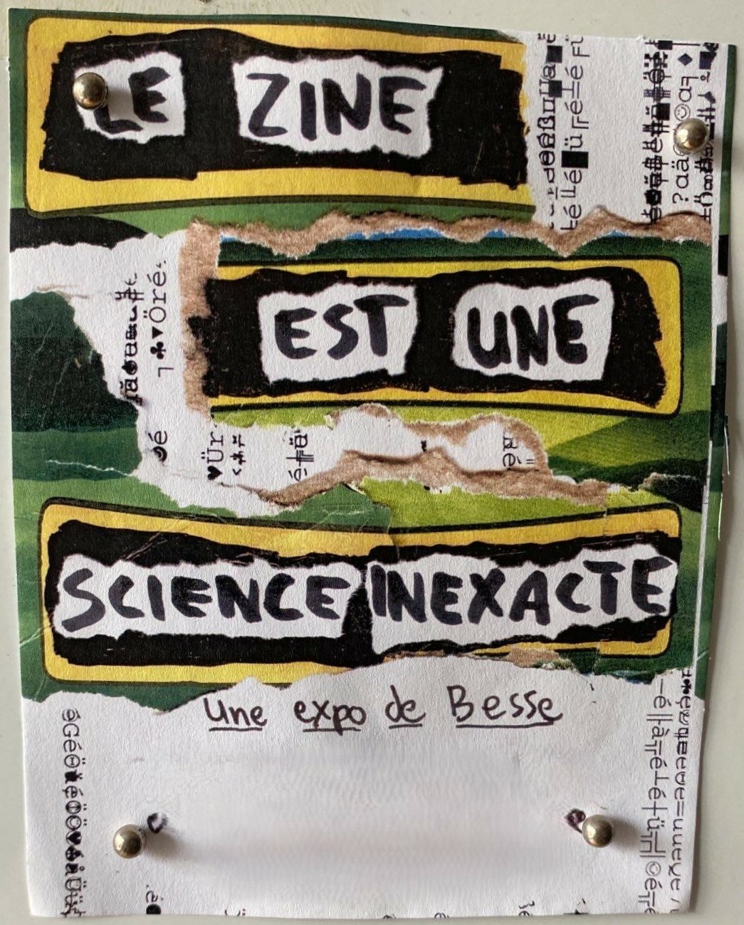 “Le zine est une science inexacte" est une expo de zines-objets-d'art-lisibles. Sept, huit zines mutants sortis de la boîte de recyclage de Besse, tenus ensemble par beaucoup de scotch tape, de bonne volonté et d'énergie sombre. Ils témoignent de ça feele comment de faire de l'art dans le contexte actuel de décalissement du monde de manière imagée, automatique et erronée.