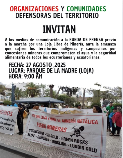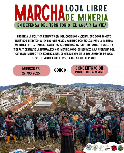 #Ecuador🔴Este 27 de agosto de 2025 sectores sociales y campesinos realizarán una marcha contra la minería en #Loja, la cual pone en riesgo las fuentes de agua para consumo humano, la agricultura y ganadería. La convocatoria es en el Parque de la Madre.