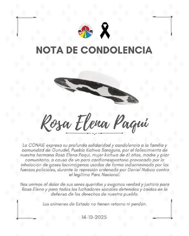 La #Conaie confirma la muerte de Rosa Elena Paqui, mujer kichwa #Saraguro de 61 años de edad, a causa de un paro cardio respiratorio por inhalación de gas lacrimógeno lanzado por la fuerza pública en la represión de ayer en #Loja