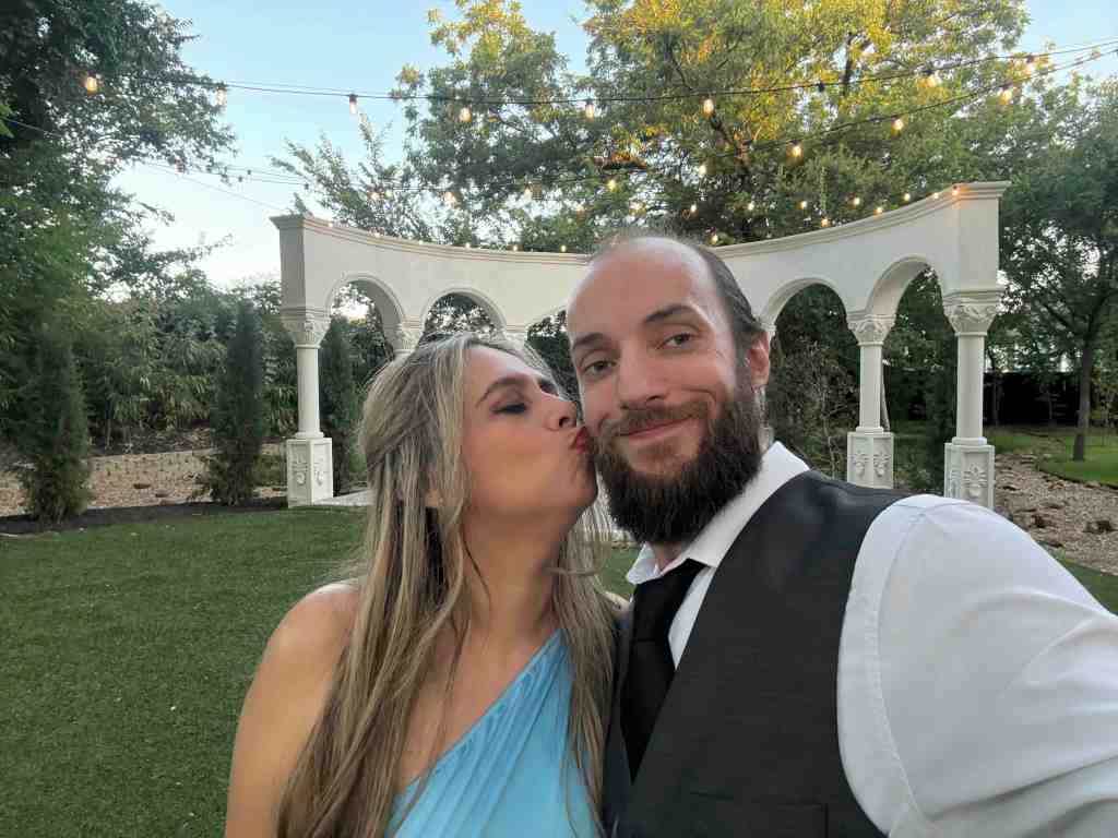 In other news, we’re back from Texas. My sister’s wedding was a success! I’ve got tons of pictures, but they’re mostly family-oriented, so I’ll pass on sharing them. Instead, settle for this picture of me and my beautiful wife.