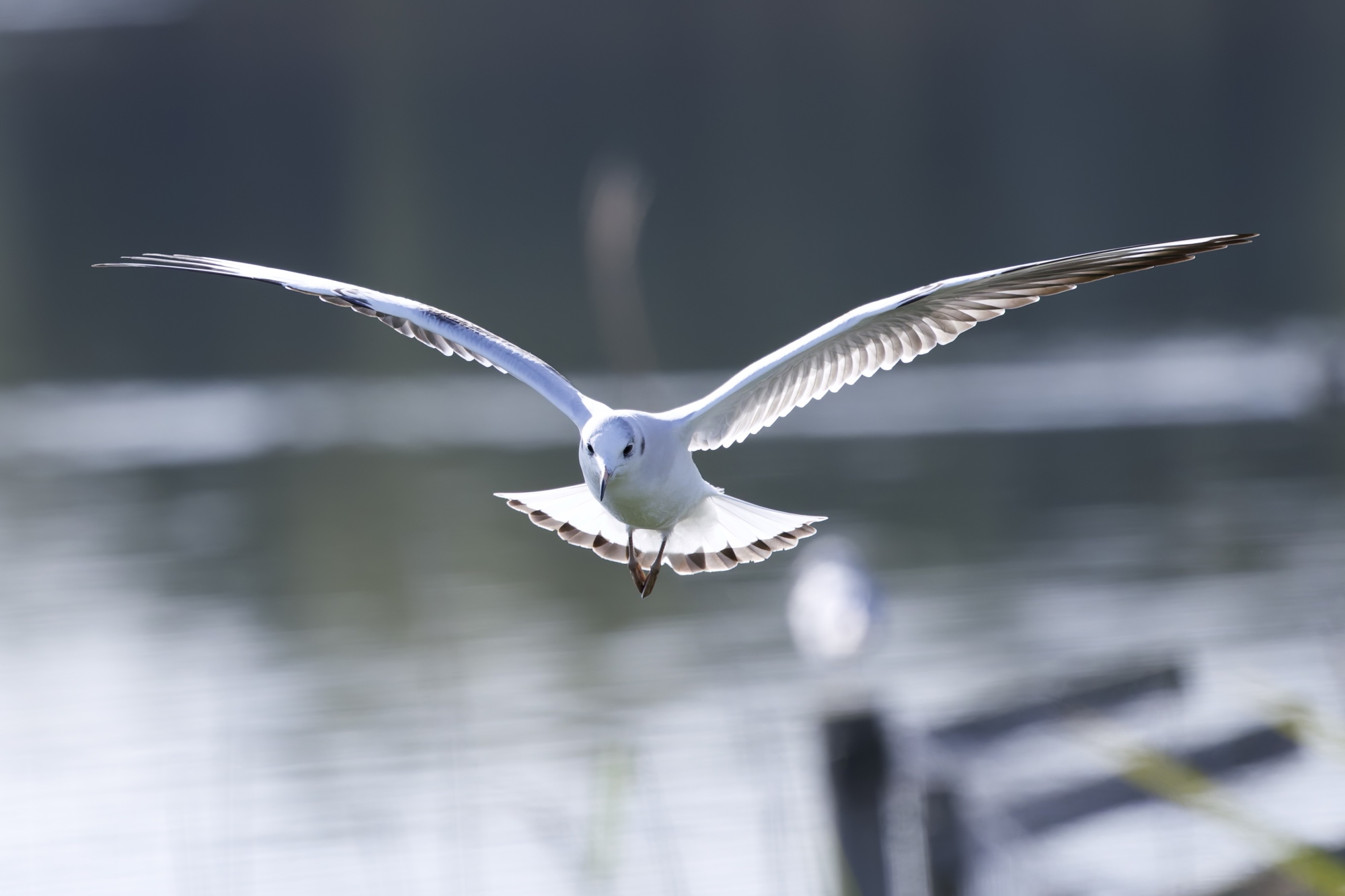 A stunning photograph captures a white seagull in full flight, wings spread wide, gliding low over calm water with a soft, blurred background. Please visit www.lukehaigh.co.uk. #Birds #lukehaigh #birdphotography #wildlifephotography #naturephotography #CanonR5ii