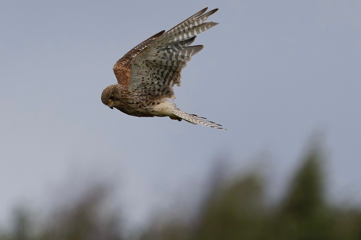 A stunning common Kestrel hovers in the sky, captured mid-flight with its wings spread, showcasing its speckled brown and rufous plumage. The background is a soft blue-grey with a blurred hint of trees below. Please visit www.lukehaigh.co.uk. #Birds #lukehaigh #birdphotography #photography