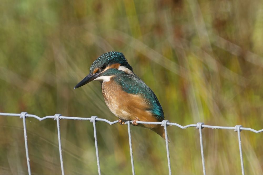 A beautiful Kingfisher perched on a wire fence, showing its vibrant blue-green and rufous plumage. A natural, blurred green and brown background enhances the subject. Please visit www.lukehaigh.co.uk. #Birds #lukehaigh #birdphotography #photography