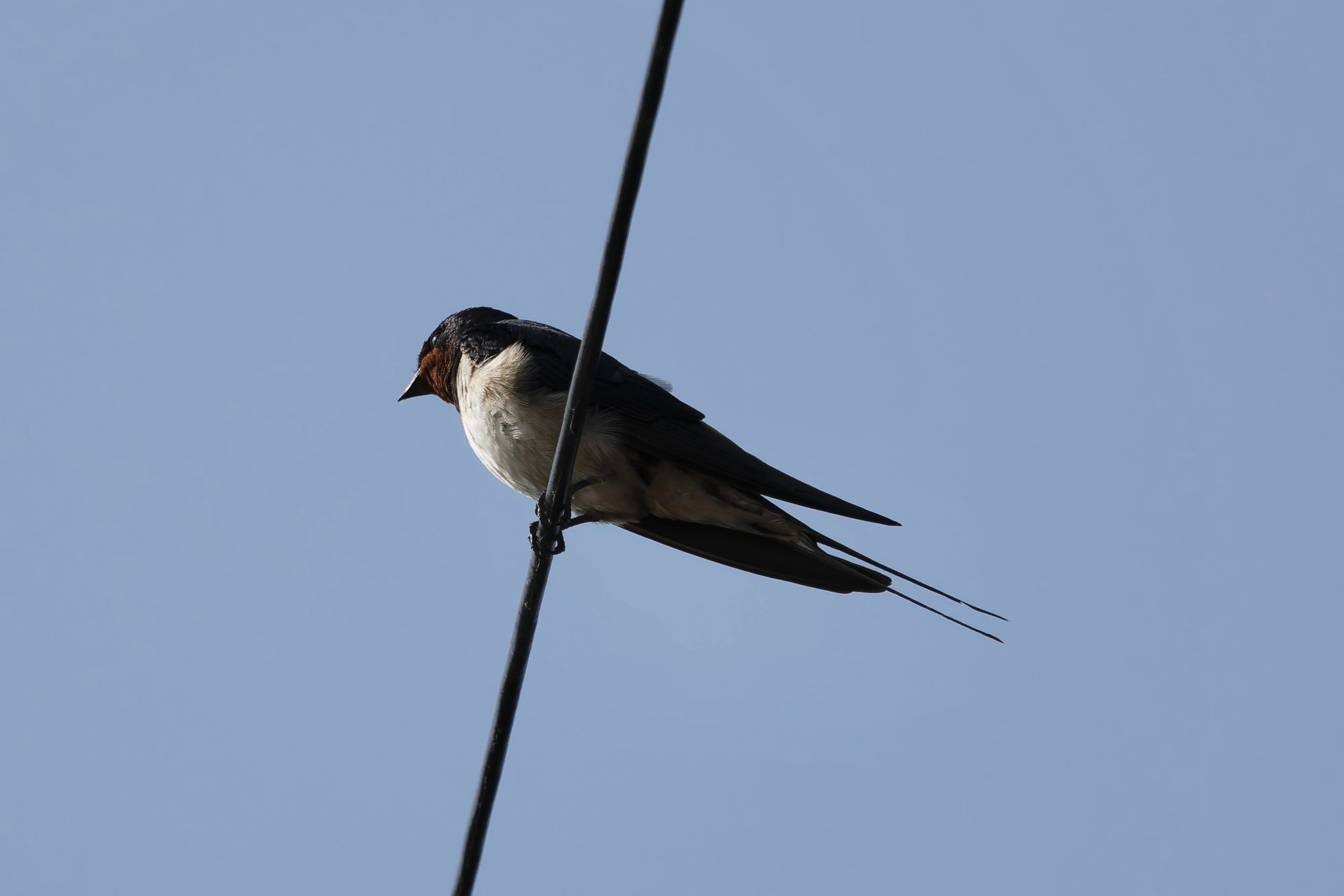 A Barn Swallow, perches on a thin wire against a clear blue sky. It has dark upperparts and a pale belly, with a reddish-brown throat. Please visit www.lukehaigh.co.uk. #Birds #lukehaigh #birdphotography #photography