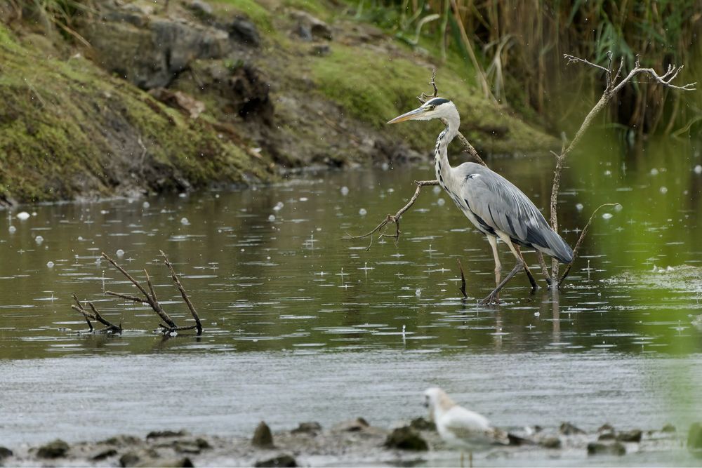 A majestic Grey Heron stands in shallow, rain-dimpled water, with a smaller white bird nearby. The scene is framed by a muddy bank and bare branches. See more at www.lukehaigh.co.uk. #Birds #lukehaigh #birdphotography #photography