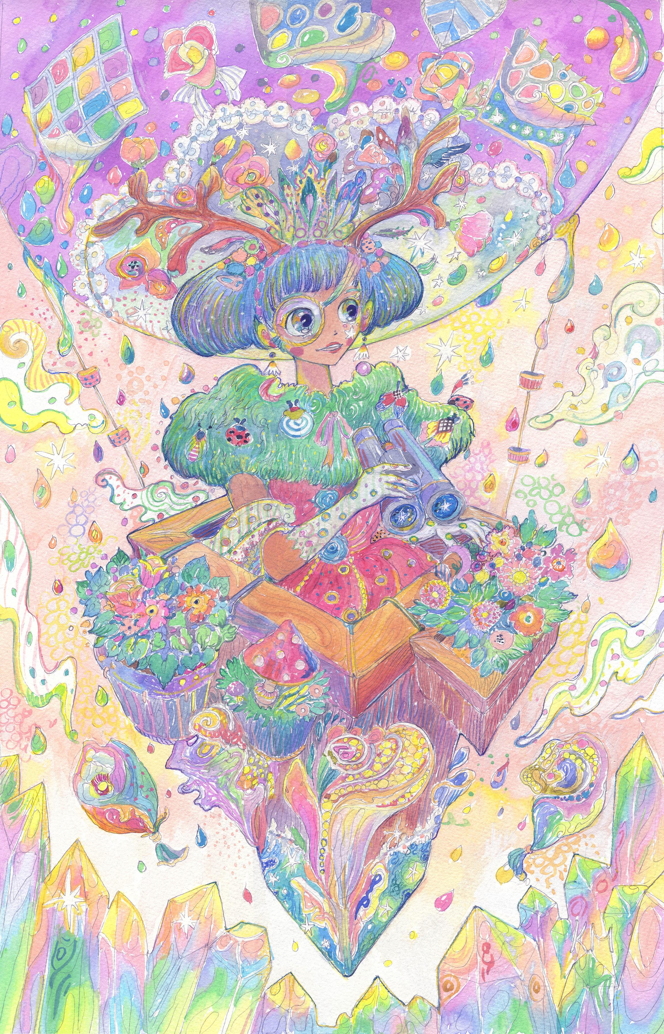 "Journey to the Multicolored Crystal Planet" — Surreal anime/manga aesthetic artwork inspired by forest folklore and science fiction.