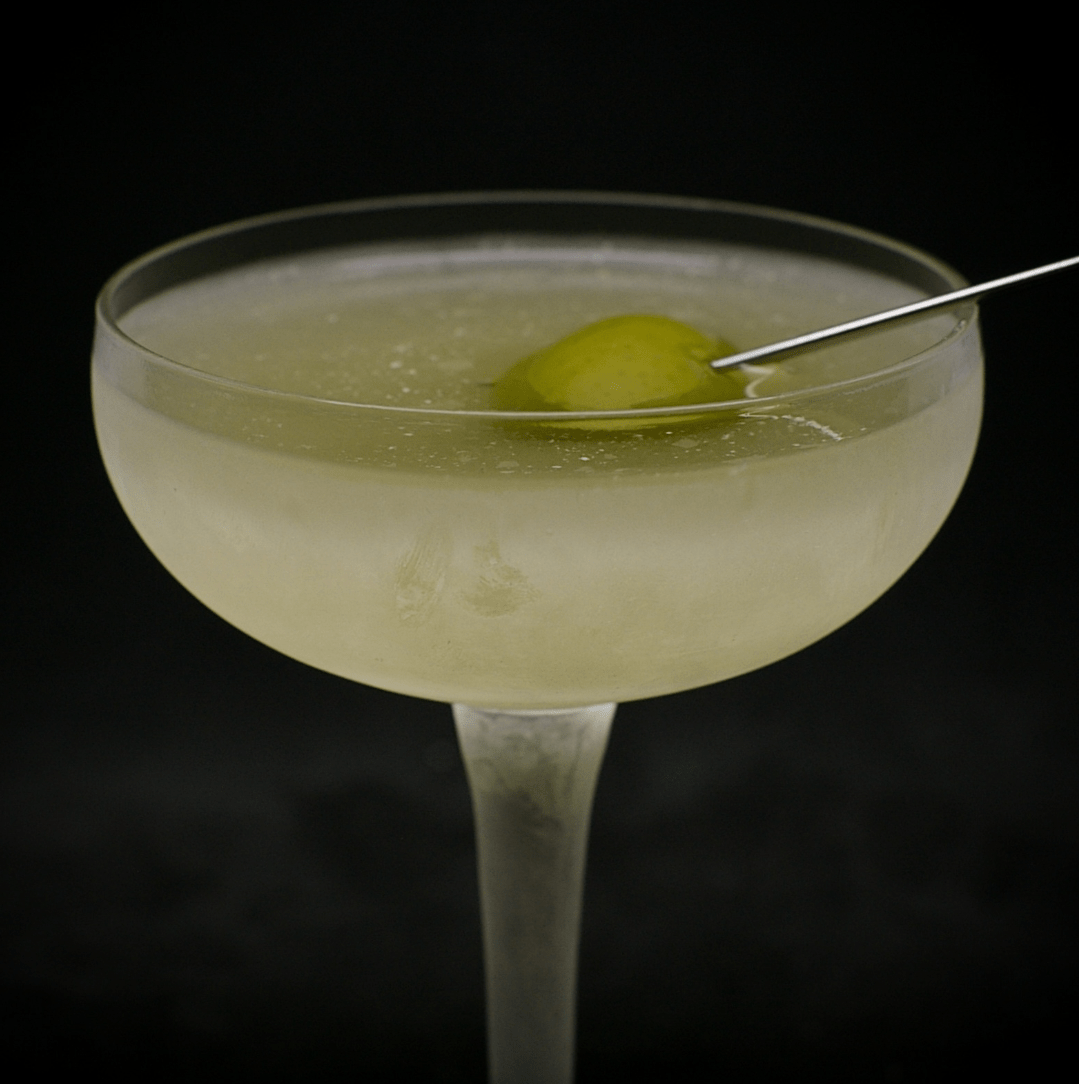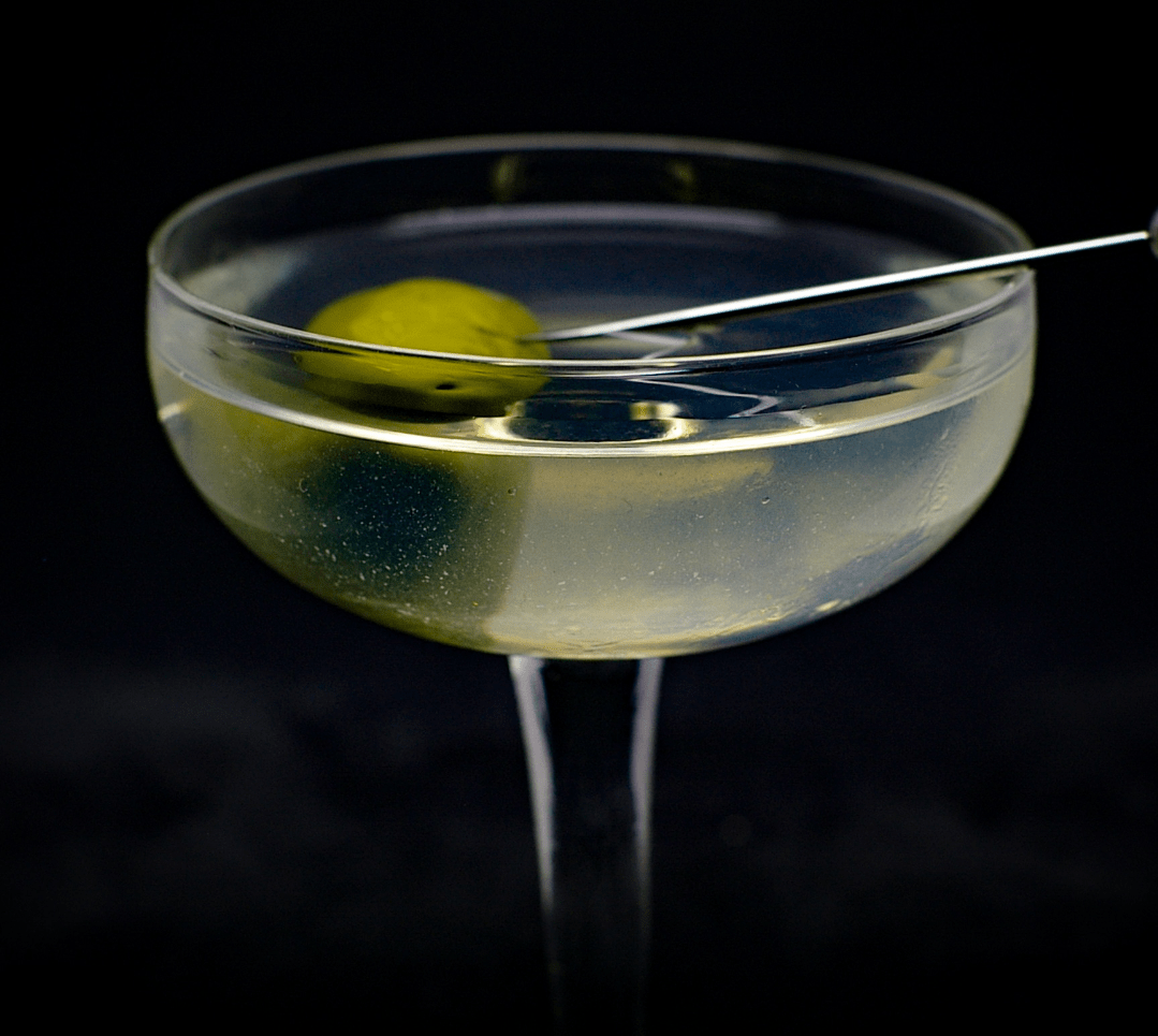 Garnish with an olive from the fridge and enjoy while it's still super cold.