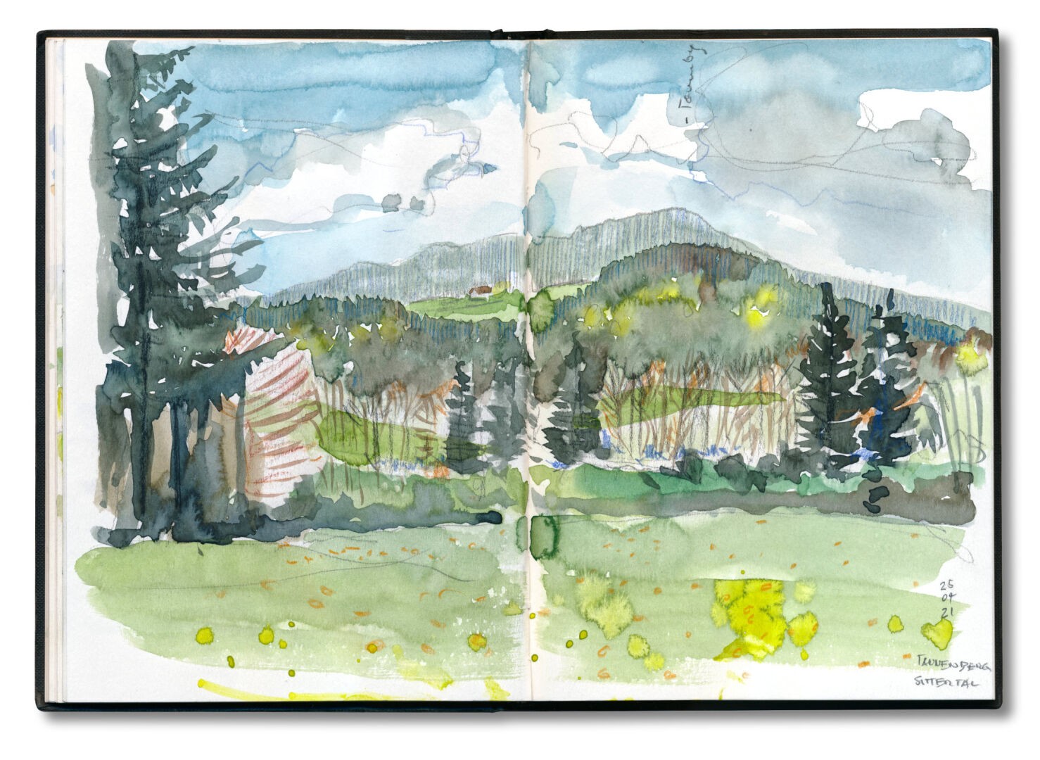 Hinunter zur Sitter mit Blick auf den Tannenberg, Skizzenbuch Fabriano A5 hoch