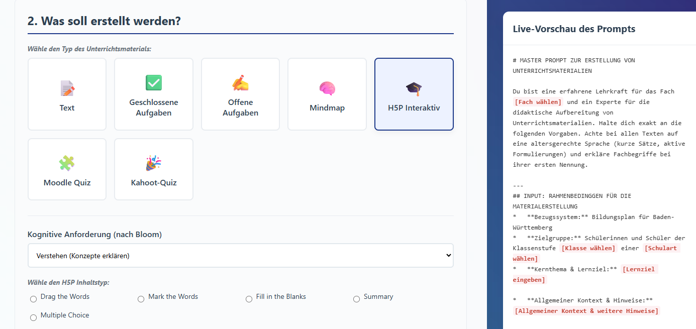 Ich bräuchte mal schwarmintelligenten Input aus dem #FediLZ, der #OER Gemeinde, der #Moodlebande und anderen. Sitze momentan an einem Prompteditor, der Masterprompts für Unterrichtsmaterial generiert. Was sollte der aus eurer Sicht (noch) können?