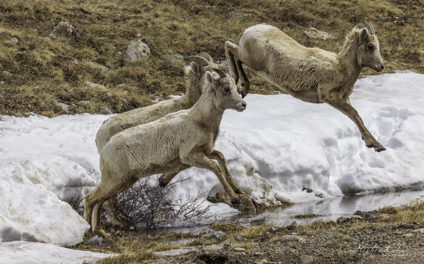 Young bighorn sheep jumping over snowmelt in the Mt Blue Sky recreational area in Colorado.