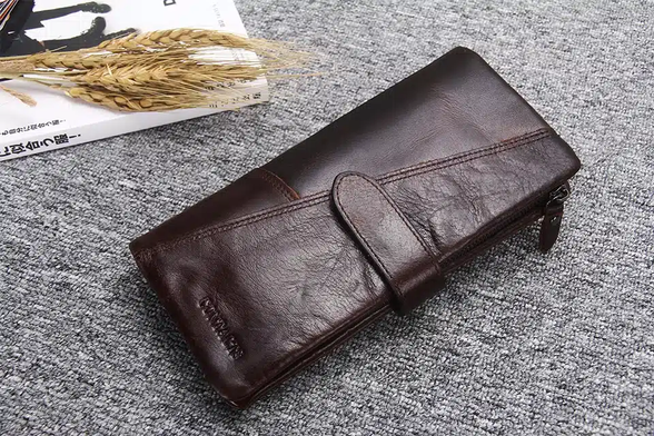 Tumepruun pikk rahakott: Elegantne ja vastupidav nahast aksessuaar.
