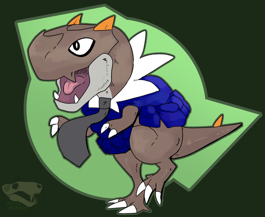 This piece was commissioned by Raharu for one of his friends of their tyrunt character looking dapper with their vest and tie!
