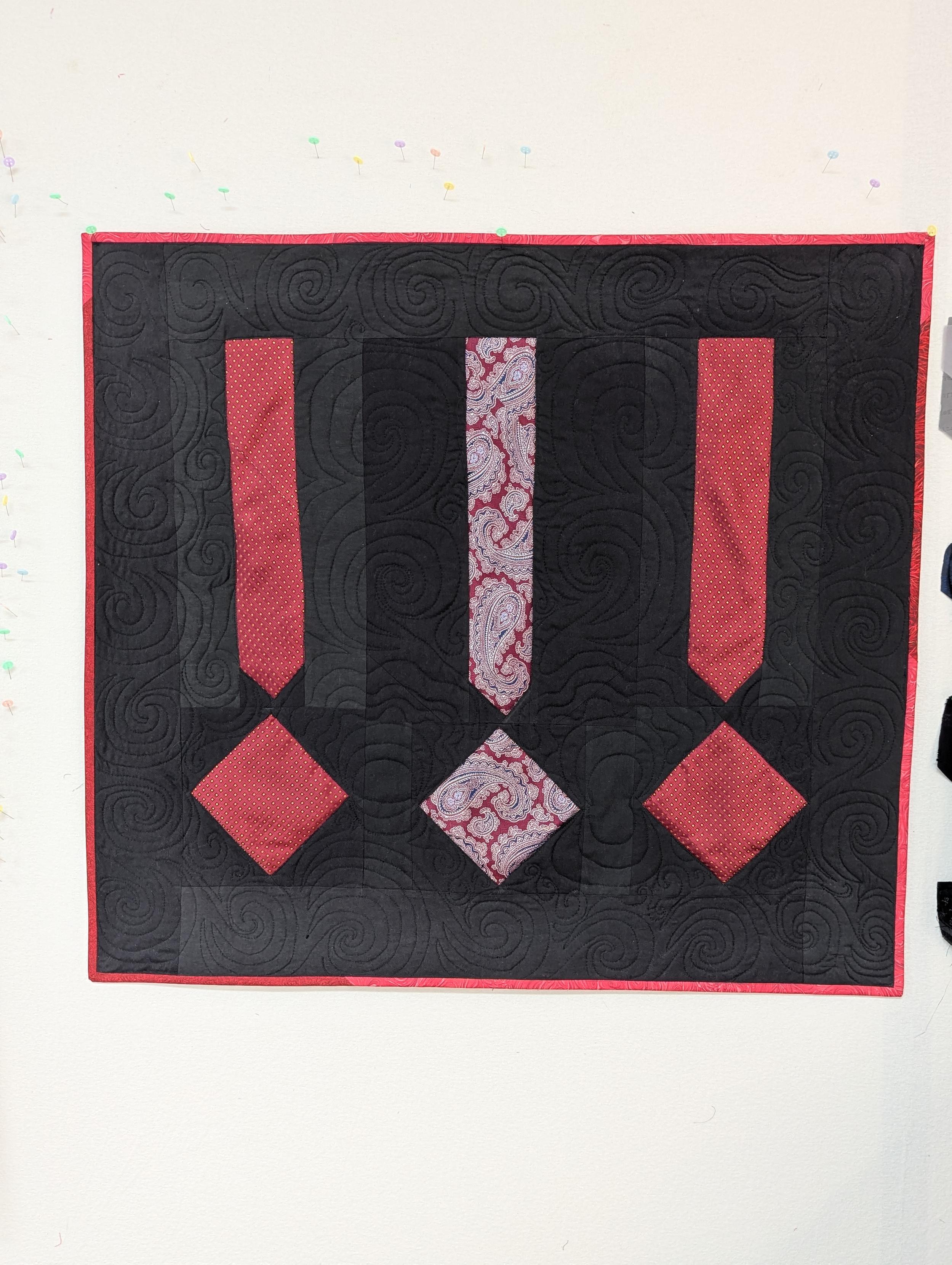 OK, here is today's finished piece. It measures overall about 34" x 31" (about 86 x 79 cm). It's called Bang! Bang! Bang! I was using this as a prototype for creating a commissioned piece. The red pieces are made from silk neckties. The black background is all cotton from my stash of fabrics. The red binding is cotton from my stash.