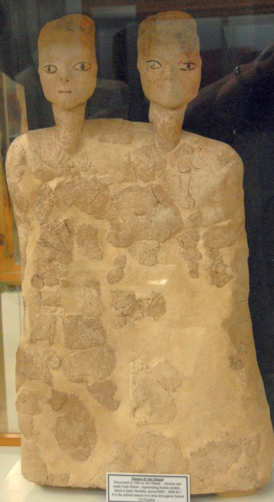 In de jaren tachtig zijn in Ain Ghazal in twee putten een stuk of dertig standbeelden gevonden, waarvoor ik zo snel geen parallellen ken. Ze dateren uit het millennium tussen 7200 en 6200 v.Chr., zijn ongeveer half zo groot als echte mensen en zijn nogal plat – ik denk zo’n tien tot vijftien centimeter dik. Het zijn mannen en vrouwen, en eigenlijk zijn alleen de gezichten een beetje gedetailleerd weergegeven. Met bitumen zijn de ogen getekend; bovenop lijken deze beelden een pruik te hebben gedragen.