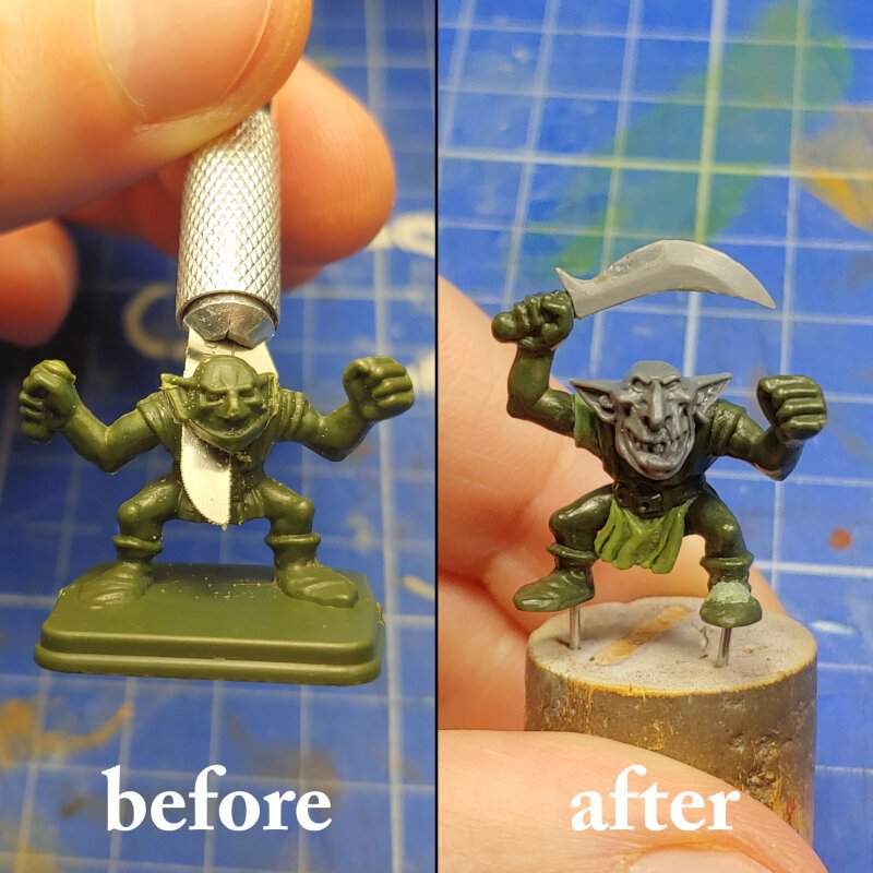 Found this guy at the flea market a couple of years ago and wanted to practice sculpting some more. The head is from the old multipart kit. Those are some of the best gobbo heads IMO, though they are a bit oversized. The blade is from the current night goblin kit, but I reshaped it with sprue goo and sanding.