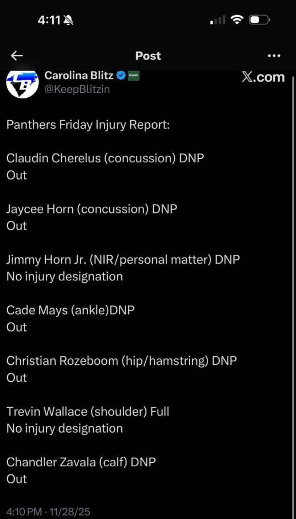 [Carolina Blitz] Friday injury report https://www.rawchili.com/4699790/ #Carolina #CarolinaPanthers #Football #NationalFootballConference #NationalFootballConferenceSouthDivision #NationalFootballLeague #NFL #NorthCarolina #Panthers