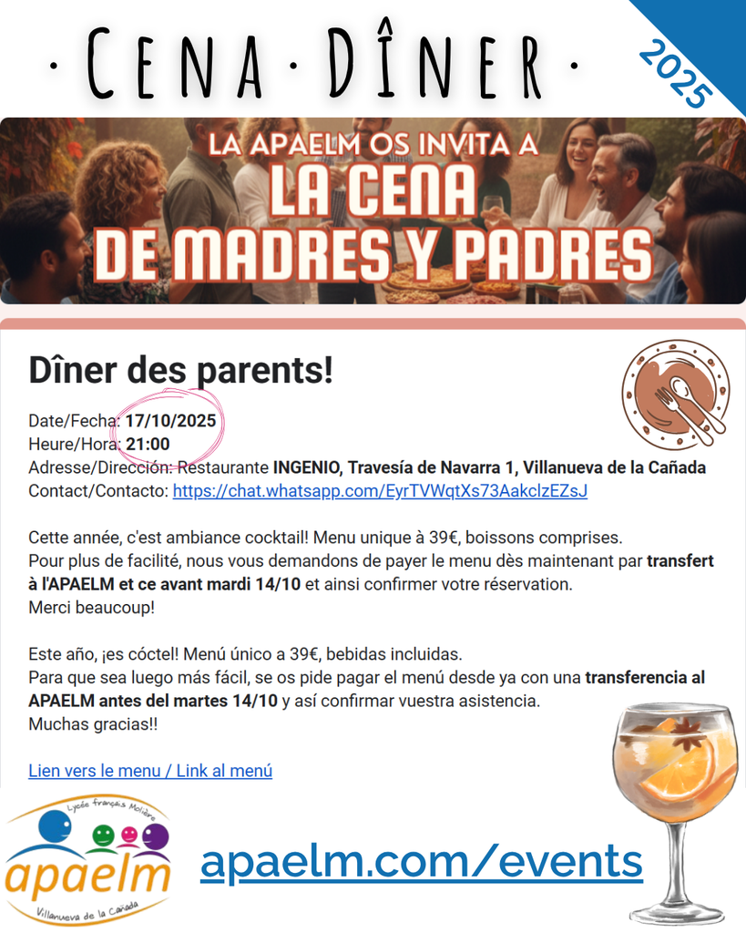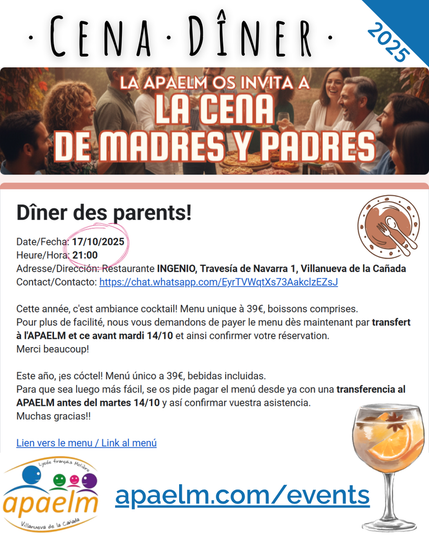 Dîner des parents ! V 17 OCT ¡Cena de Madres y Padres!