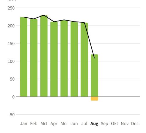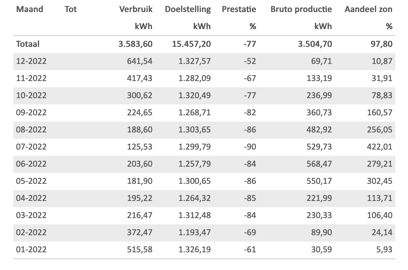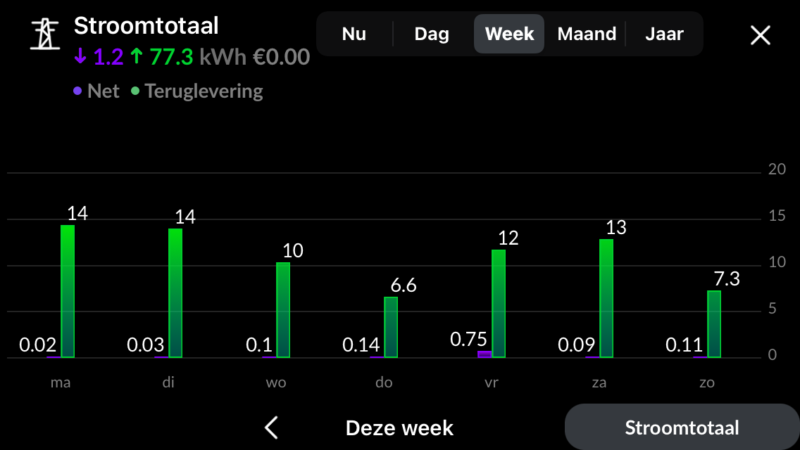 We just received our "jaarafrekening". This is the final yearly invoice sent by our energy company. They are about to pay us €252, and we will continue to pay them €5 per month next year, just like last year. i.e. overall our energy company is paying us about €200 for last year's electricity. Everything in our home is powered by electricity. No gas connection. No wood burner.