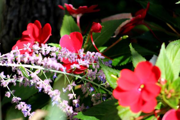 Russian Sage with Impatiens in this Old Coot's Garden. #russiansage #impatiens #flower #flowers #garden #gardening #gardener #pennsylvaniagarden #pennsylvaniagardens #fecund #growingseason #summer #splendid #red #posy #posies #oldfashioned