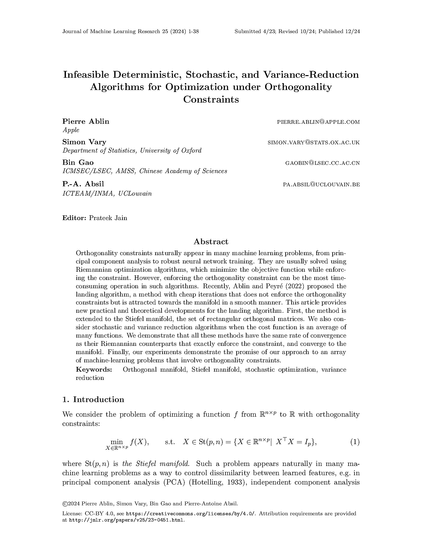 'Infeasible Deterministic, Stochastic, and Variance-Reduction Algorithms for Optimization under Orthogonality Constraints', by Pierre Ablin, Simon Vary, Bin Gao, Pierre-Antoine Absil.