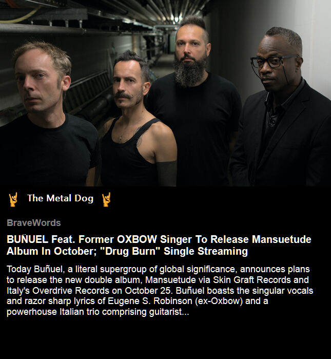 #TheMetalDogArticleList #BraveWords BUĂUEL Feat. Former OXBOW Singer To Release Mansuetude Album In October; "Drug Burn" Single Streaming bravewords.com/news/bunuel-... #Buñuel #Oxbow #Mansuetude #EugeneSRobinson