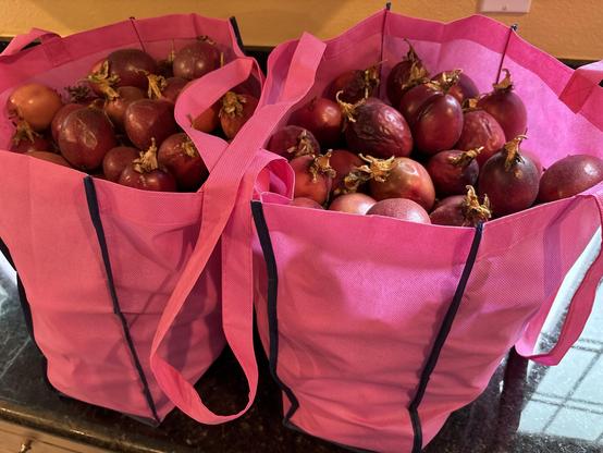 What to do with so many passion fruit? Huge crop this year. Two bags like this already went to a brewer friend for a wheat beer. This turns into about 5 quarts after processing to remove seeds. Freezing some as cubes for later. Trying a few variations of homemade liqueur (vodka+PF+vanilla, vodka+PF+cinnamon, rum+PF+vanilla). Still have 3 quarts in the fridge…