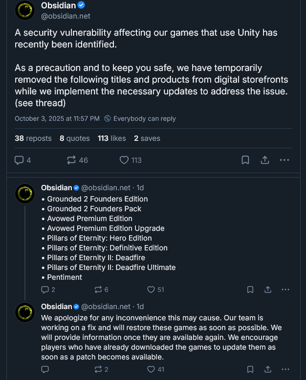 Mm. Obsidian on ilmoittanut, että sen pelien saatavuuksissa on ollut hiljattain poikkeavuuksia varotoimien johdosta.