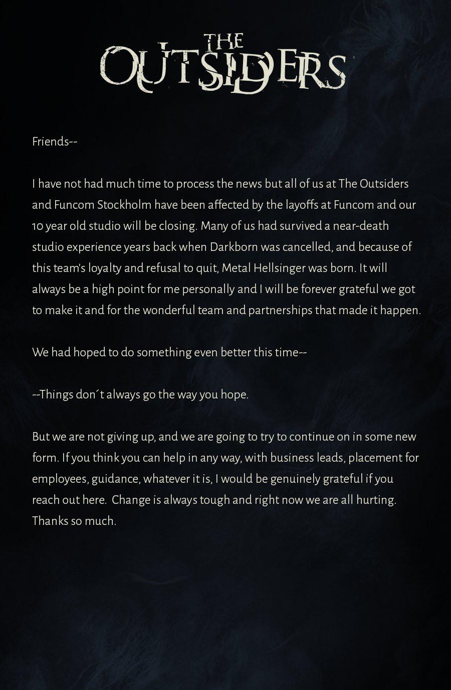 Metal: Hellsinger -kehittäjä The Outsiders sulkee ovensa Funcom-pelitalon hiljattain vahvistettujen irtisanomisten yhteydessä. Kymmenen vuotta pyörinyt tukholmalainen studio työsti aikoinaan myös hirviöpeli Darkbornia, jonka kohtalona oli kuitenkin peruuntuminen vuonna 2020. Studiota veti Battlefield- ja Payday 2 -konkari David Goldfarb.