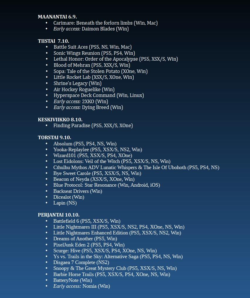 #Battlefield6 #DreamsofAnothee #LittleNightmares3 #Absolum #BattleSuitAces #2XKO #YookaReplaylee #DaimonBlades #Carimare #Battlefield #LittleNightmares #suomi #Steam #playstation #xbox #nintendo #uutuuspelit #pelit #peliuutiset