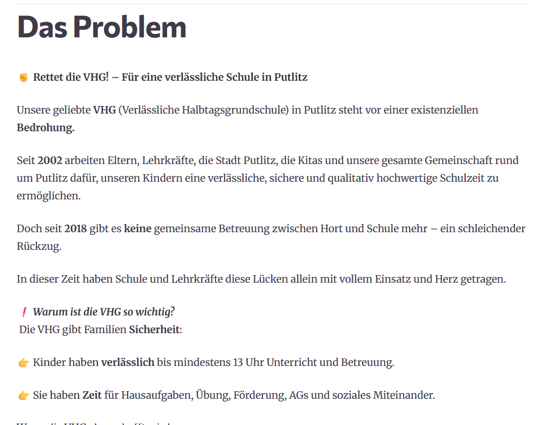 ich habe gerade die Petition „VHG in Gefahr -Rettet die Schule in Putlitz!“ unterschrieben und wollte dich fragen, ob du auch mitmachst.