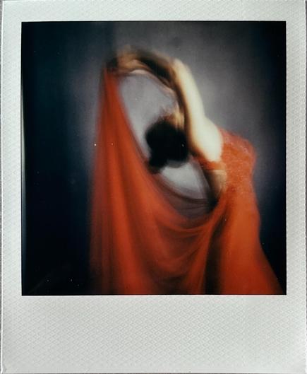 Ce Polaroïd capte plus qu’un geste : un abandon, un souffle suspendu, une présence invisible qui prend forme dans la traîne écarlate.