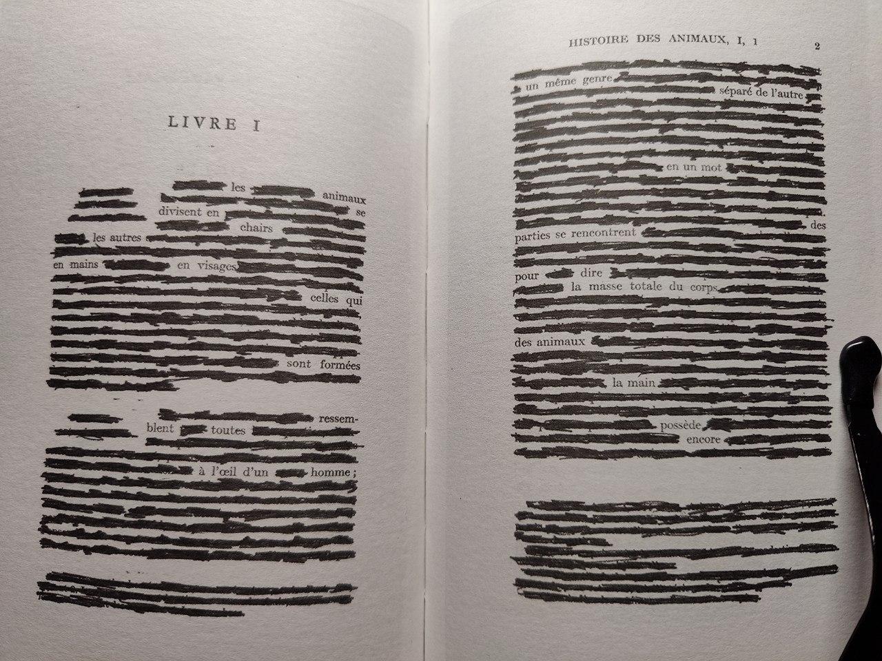 Au niveau formel, dans une partie du recueil, l'autrice construit sa prose à partir de l'"Histoire des animaux" d'Aristote, dont elle noircit la majorité des lignes d'écriture pour ne conserver que quelques mots par page.