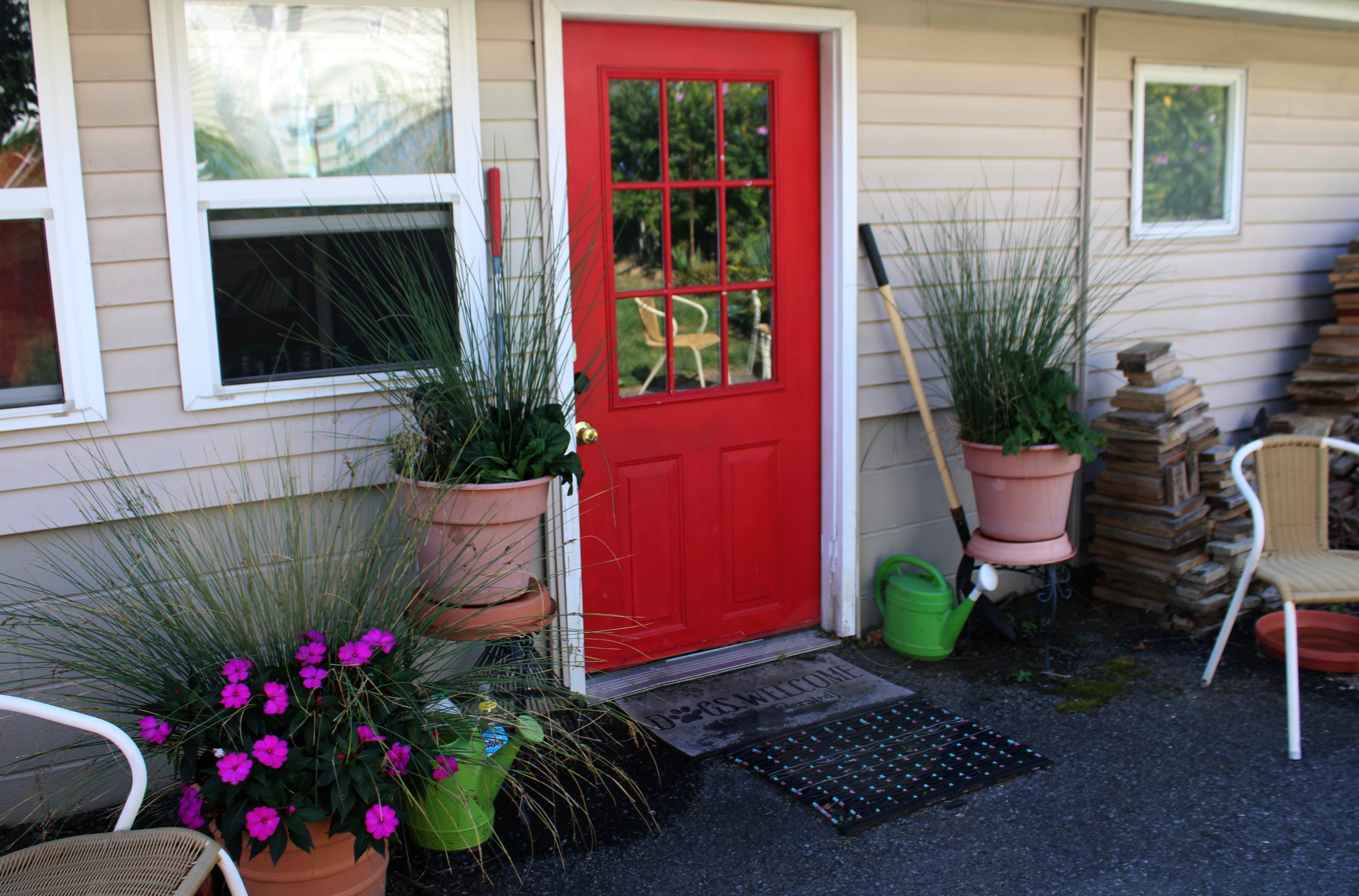 Our backdoor with potted plants. #plants #pottedplants #potplants #backdoor #door #doorway #red #reddoor #entry #entryway #curbappeal #rearappeal #summer #summertime #warmweather #endofsummer