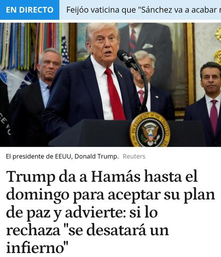 #Trump da a #Hamás hasta el Domingo pata captar su plan de #paz, y advierte : si lo rechaza "se desatar un #infierno" #Premio #Nobel del #infierno www.elespanol.com/mundo/202510...