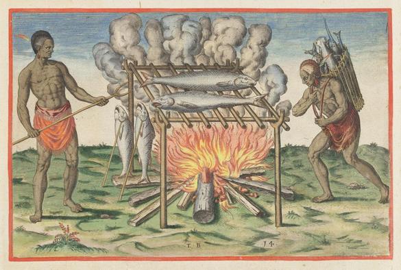 The broiling of their fish over the flame (1590) by Johann Theodor de Bry, from Briefe and True Report.