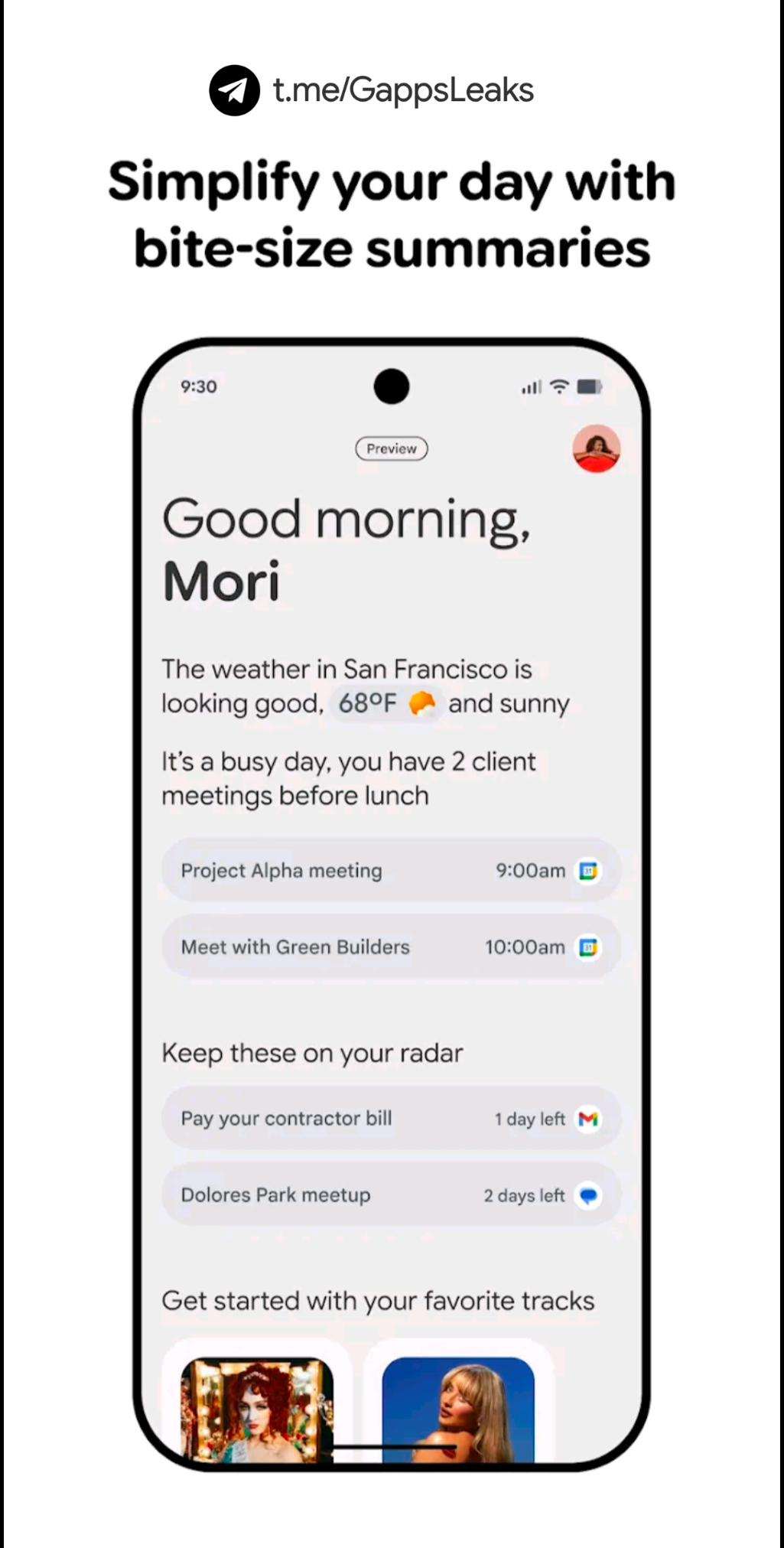 At the top, you can see an overview of your day with weather and travel info, #calendar highlights, and important personal #reminders.