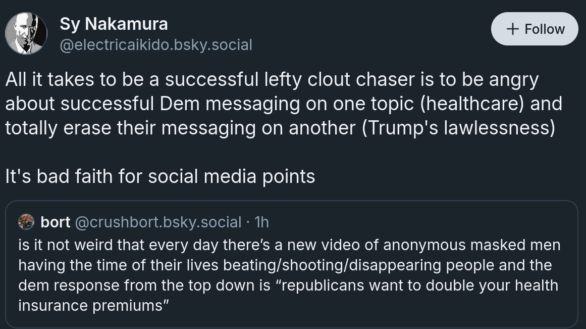Yeah, we're all just " #lefty clout chasers." Nobody who wants #healthcare or an end to #war is sincere; it's all just a big jerkoff session that's becoming a real nuisance to the Serious Adults in the #DemocraticParty who are busy collecting #donations while promising results that never surface.
