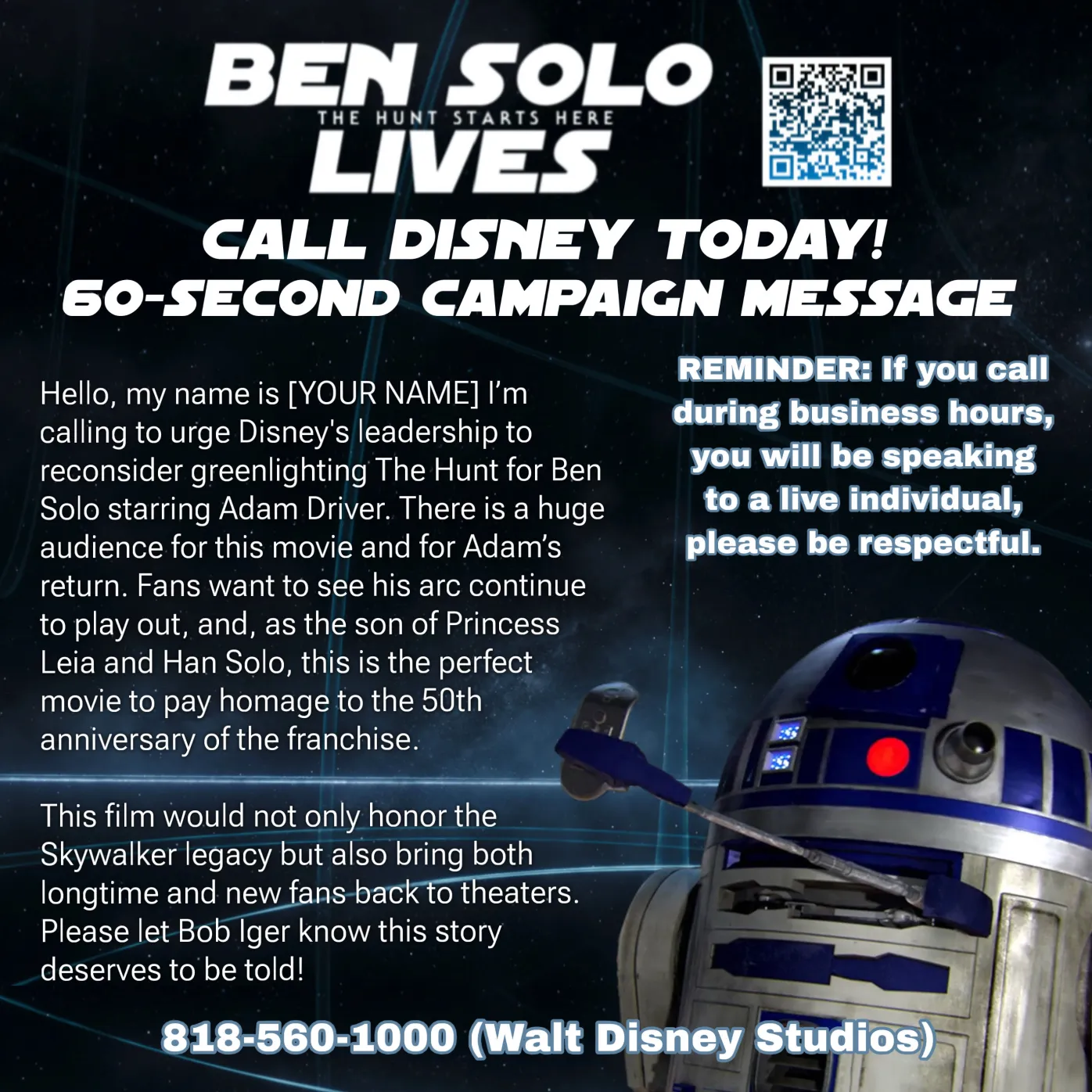 While we continue to send letters to Disney this month, today we are encouraging everyone to call Disney and use this 60-second campaign message to encourage them to greenlight #TheHuntForBenSolo