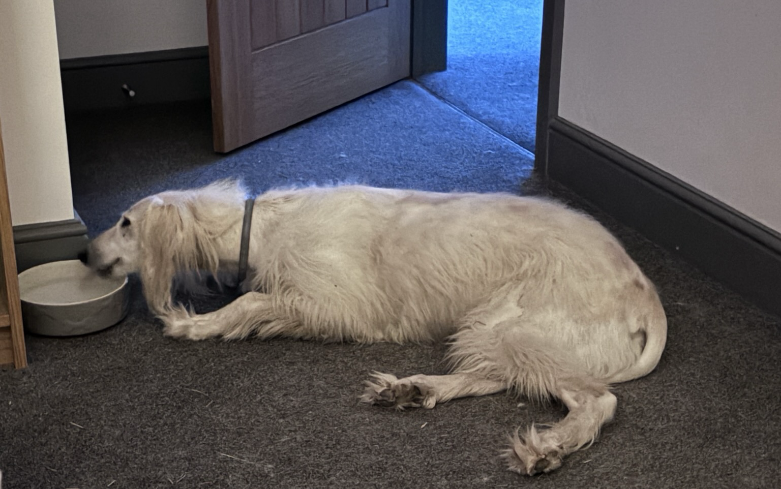I sat with some Green Tea & he loved his carrots & treats & all the social attention. Not all dogs love the kind of spaces but his #Lurcher / #saluki mix, I think makes him mostly un afraid of humans (who are in good moods.)