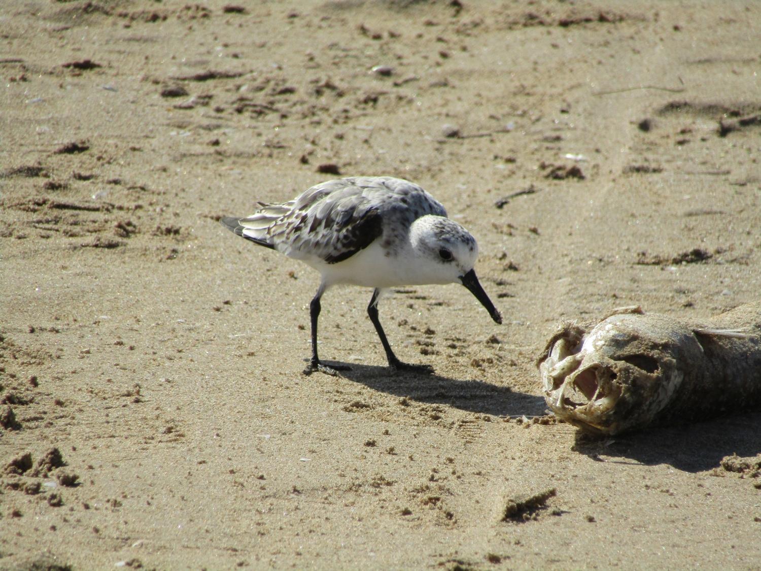 Chorlitejo patinegra - oder auch Regenpfeifer - riecht an einem etwas gammeligen Fisch. Oder vielleicht findet er ihn einfach zu sandig?